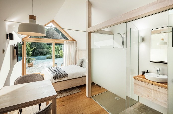 Dieses moderne Holzhaus entsteht in Modulbauweise. Sie können dabei alle Paramenter mitgestalten, von Dachform über Grundrisse bis zur Gestaltung von Küche, Bad, Wandfarben und Böden. Ein Bungalow STYYLE C entspricht den Anforderungen eines Effizienzhauses 40 und ist förderfähig.