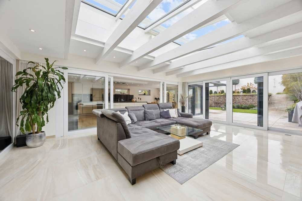 Das Glasdach im Wohnbereich sorgt für ein besonderes Raumgefühl und füllt den Innenraum mit natürlichem Tageslicht.