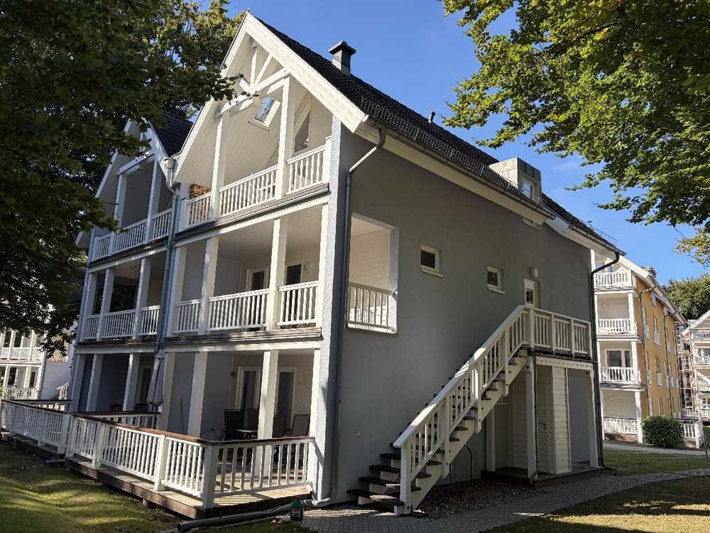 Diese schöne 4-Zimmer Maisonette-Wohnung mit ca. 109 m² Wohnfläche befindet sich im 1. Obergeschoss einer gepflegten DHH mit 4 Wohneinheiten, eingebettet in einem von Bäumen umgebenen und naturgeprägten Strandpark in Graal-Müritz, weniger als 200 Meter von der Ostsee entfernt. Das Haus wurde 2008 in einer Holzständerbauweise im Bäderstil errichtet und sorgt für ein sehr gutes Wohnklima. Die Wohnung besticht durch die großzügige Raumgestaltung über zwei Ebenen mit 3 Schlafzimmern, 2 Bädern, einem großen Wohn-Essbereich mit offenen Giebeln und einer eigenen Sauna sowie einer Whirlwanne. Zwei große überdachte Balkone bieten zudem viel Platz zum Verweilen und Entspannen. Alle Wohn- u. Schlafräume sind mit nützlichen und hochwertigen Möbeln - mit viel Liebe zum Detail - eingerichtet. Die Küche mit großer Sitzecke ist mit einer Einbauküche und Elektrogeräten von Siemens und AEG ausgestattet. Die Wohnräume, Badezimmer und Flure sind gefliest und werden mit einer Fußbodenheizung betrieben, die Schlafzimmer sind allesamt mit Laminat als Bodenbelag ausgestattet, die Wärmeversorgung erfolgt durch elektrische Wand-Konvektoren. Zu der Wohnung gehört ein ausgewiesener PKW Stellplatz, direkt vor dem Haus. Ein gemeinschaftlich nutzbarer Garten steht den Bewohnern zur Verfügung und rundet das Gesamtangebot ab.