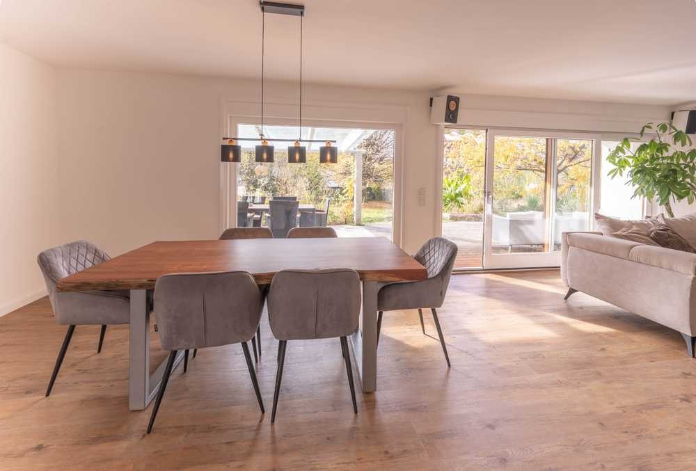 Dieses 1968 in massiver Bauweise errichtete Haus besticht durch seinen modernen Schnitt und seine Süd-West-Ausrichtung. Besonders hervorzuheben ist der großzügige Wohn- und Essbereich im Erdgeschoss, der nahtlos in das große Wohnzimmer übergeht. Von hier aus haben Sie direkten Zugang zum wunderschönen riesigen Garten, der mit einem künstlich angelegten Teich sowie einer überdachten Holzterrasse zum Entspannen und Verweilen einlädt. Ein gemütlicher Holzofen sowie eine moderne Einbauküche rundet das Erdgeschoss ab.