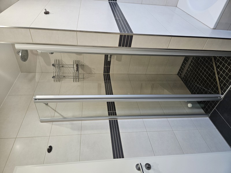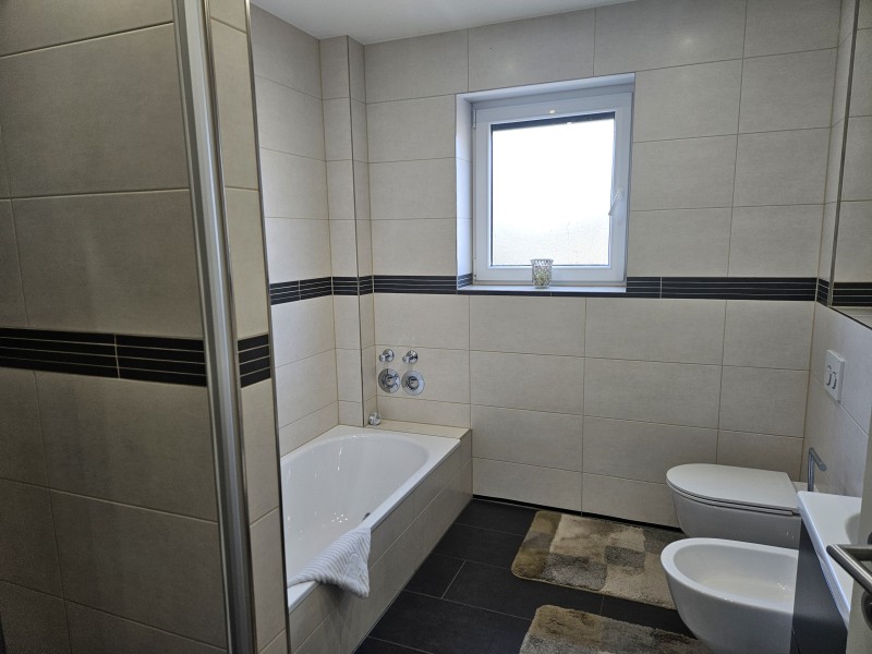 Das helle Tageslichtbad verfügt über eine Dusche, eine Badewanne sowie ein Fenster. Zusätzlich stehen ein praktischer Hauswirtschaftsraum und ein separater Abstellraum zur Verfügung – ideal für zusätzlichen Stauraum.