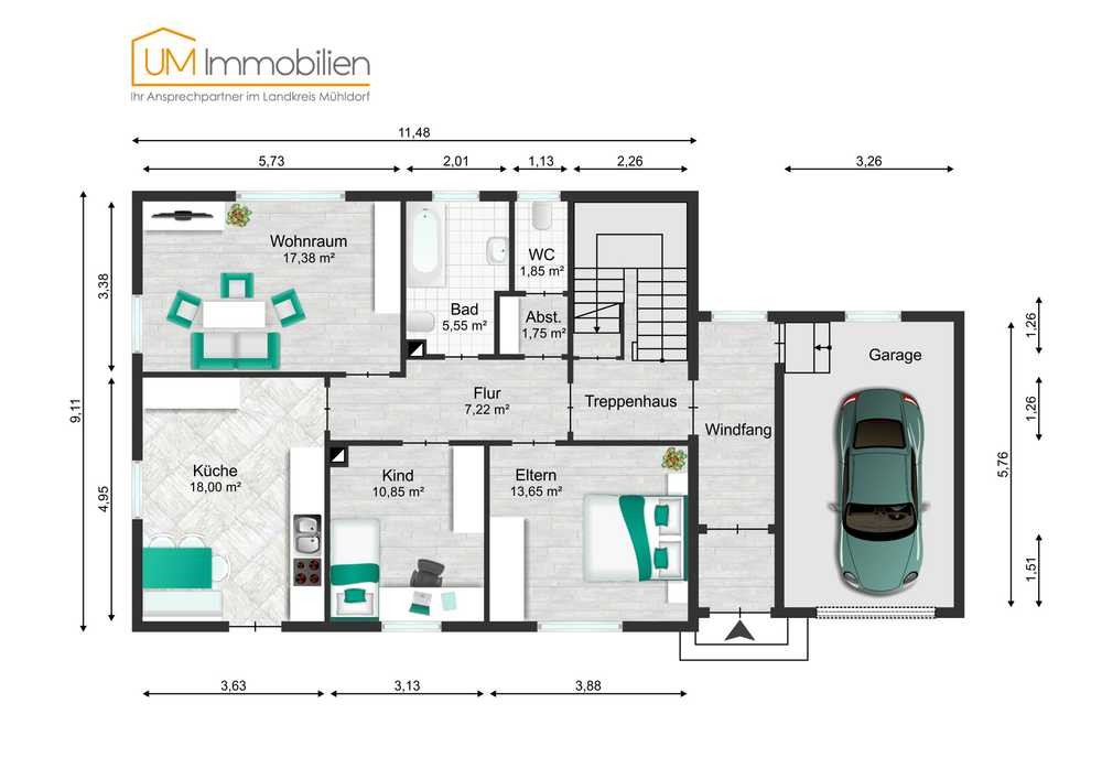 Auch hier stehen drei Zimmer zur Verfügung, jedoch in leicht abgewandelter Anordnung: Neben Abstellkammer, WC und Badezimmer mit Fenster, Dusche und Wanne finden Sie ein Elternschlafzimmer, ein Wohnzimmer mit vorgelagertem Balkon, eine separate Küche und ein weiteres Kinderzimmer.