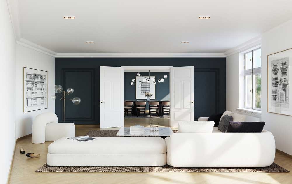 Diese sehr durchdacht geplante Altbauwohnung bietet neben den beiden Schlafräumen ein geräumiges und helles Esszimmer, dass durch zwei breite Flügeltürelemente vom großzügigen Wohnzimmer abgetrennt werden kann. Die Fläche des Wohn-/Essbereiches beträgt gesamt ca. 54 m², hier dringt durch die Westausrichtung und durch die großen Fenster viel Tageslicht ein.