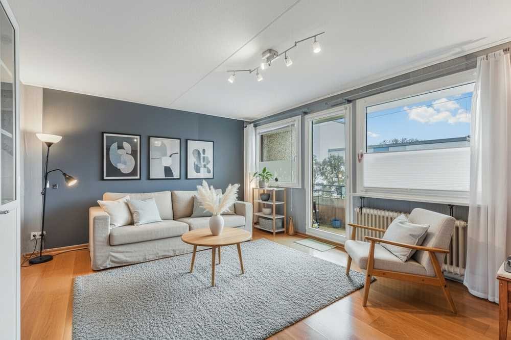 Das Wohnzimmer ist durch die große Fensterfront sehr hell und bietet genug Platz für eine Sofalandschaft, auf der Sie sich nach einem anstrengenden Tag entspannen können. Auf dem Balkon können Sie schöne Tage ausklingen lassen.