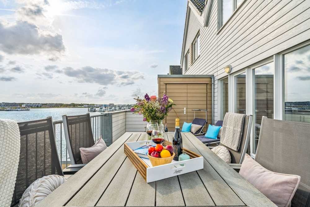Die 93 m² große Ferienwohnung besticht durch ihre einmalige Lage zwischen der Schlei und dem Hafenbecken des OstseeResorts Olpenitz – näher am Wasser kann man kaum wohnen.
