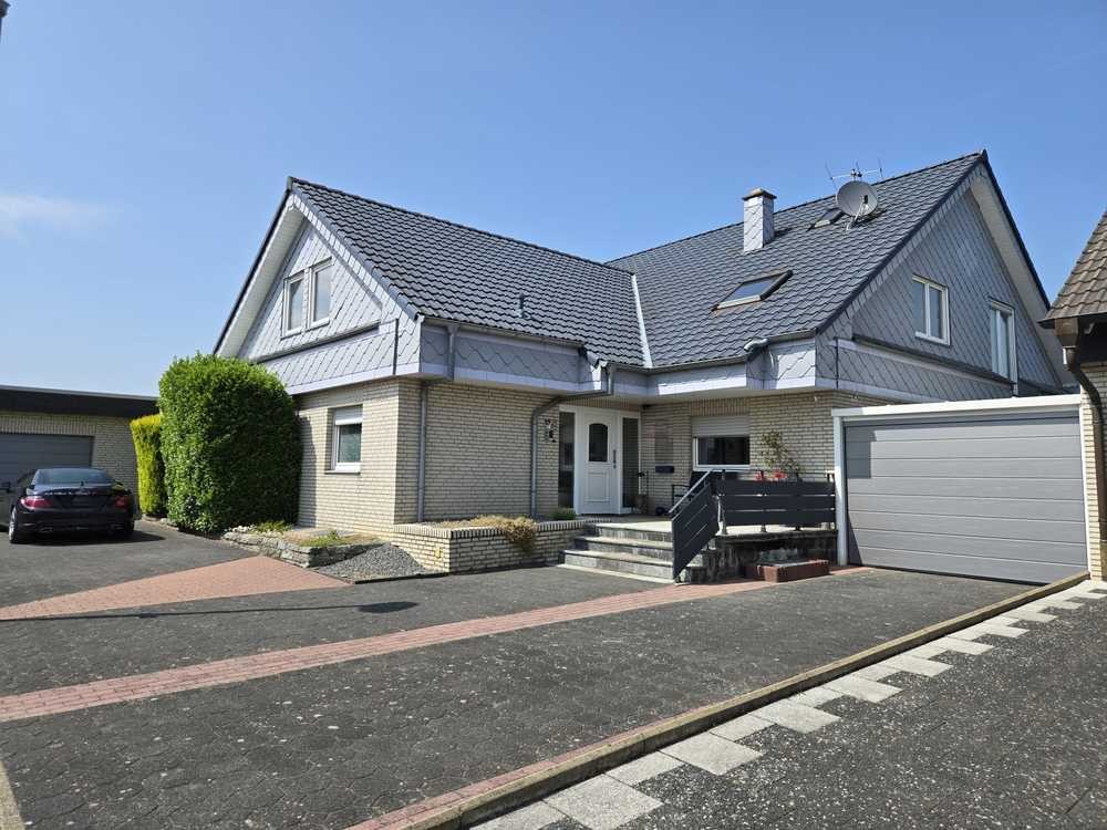 Hierbei handelt es sich um ein freistehendes, massiv gebautes Wohnhaus. Es ist eingeschossig mit erweitertem Satteldach, voll unterkellert und verklinkert. Das Haus hatte ursprünglich ein Flachdach. In 2000 wurde ein aufwendiges erweitertes Satteldach (ähnlich wie ein Walmdach) darauf gebaut. Der Ausbau wurde mit Kunststofffenster mit Isolierverglasung, Leimbinder und Holzständerwerke bereits vorbereitet. Die Giebelseiten sind von außen verschiefert und das Dach ist bereits gedämmt. Die Kubatur beträgt für das Wohnhaus (Keller u. Erdgeschoss) = 1.144,76 m³ zzgl. Dachgeschoss 536,35 m³ = 1.681,11 m³ gesamtes Wohnhaus zzgl. Garagen.