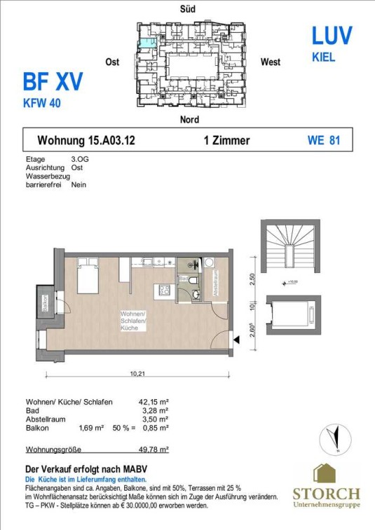 Die 1-Zimmer-Neubauwohnung mit Balkon hat ca. 49,78 qm die sich wie folgt aufteilen: