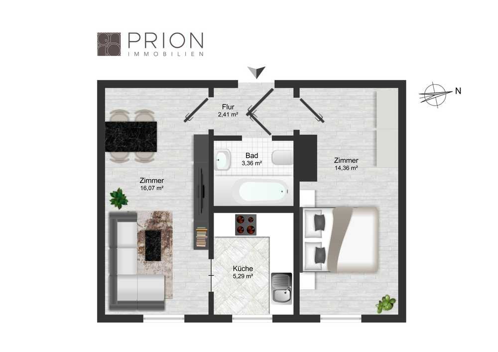 Mit einer Wohnfläche von ca. 41,49 m² überzeugt die Wohnung durch einen klaren, funktionalen Grundriss. Zwei Zimmer sind bequem vom Flur aus erreichbar. Die Küche ist direkt vom Wohnzimmer aus zugänglich und sorgt so für kurze Wege im Alltag. Sie verfügt über eine Einbauküche, die zwar bereits etwas in die Jahre gekommen, jedoch weiterhin funktionstüchtig ist – ein Austausch der Fronten könnte hier im Handumdrehen für ein modernes Erscheinungsbild sorgen.