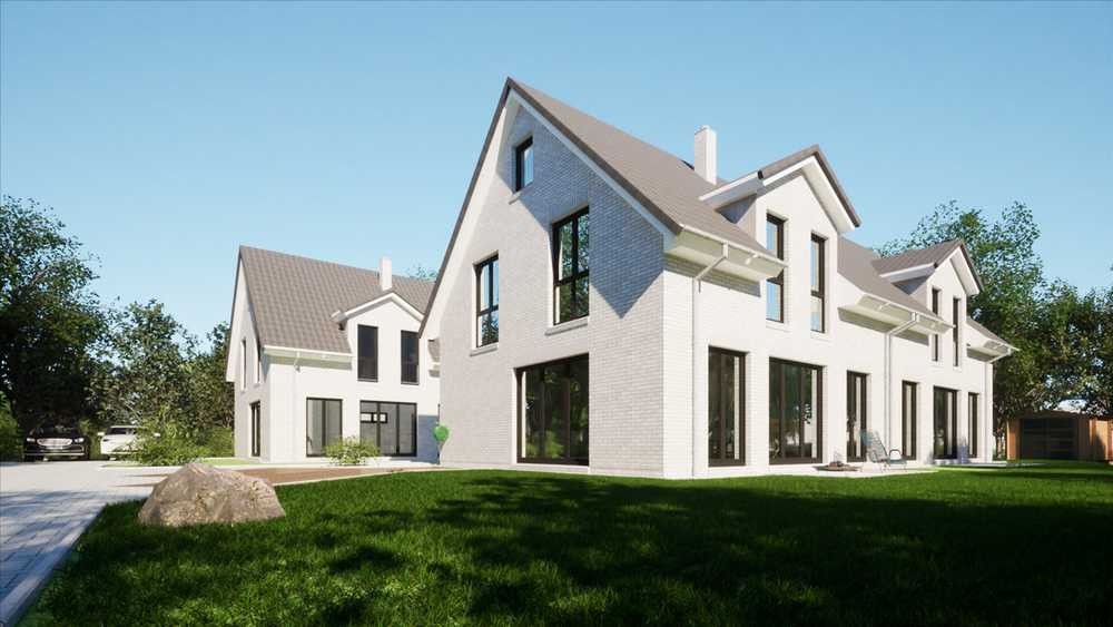 Wir errichten hier vier Doppelhaushälften. Die hier abgebildeten Doppelhaushälften mit Satteldach verfügen über je ca. 135,00 m² Wohnfläche (nach DIN 277). Weiter steht im Dachgeschoss noch eine nutzbare Fläche von ca. 30,00 m² zur Verfügung. Hier kann beispielsweise eine Gäste-Zimmer oder Büro entstehen. Die Doppelhäuser werden in Massivbauweise individuell nach Ihren Wünschen geplant und gebaut. Hier bieten wir den Effizienzstandard KfW 55 an, bei welchem bereits eine Luftwasserwärmepumpe, Fußbodenheizung und eine 3-fach-Verglasung inbegriffen sind.