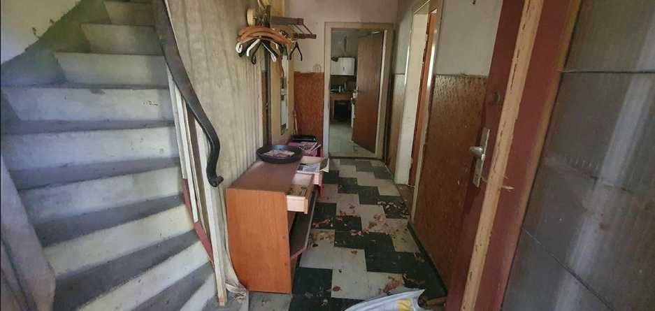 Das Hauptgebäude ist voll unterkellert und bietet auf Kellerebene eine Durchgangsgarage unter dem Wintergarten. Das Haus ist stark sanierungsbedürftig, eröffnet aber mit durchdachter Planung großes Potenzial für großzügiges Wohnen inmitten der Natur.