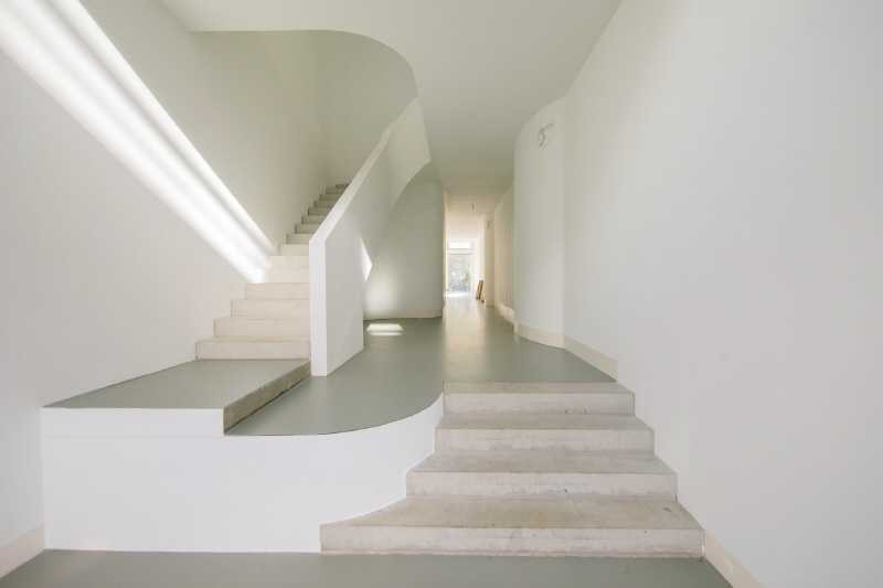 Nach Osten wurde eine großflächige Alufassade als Hausverkleidung gewählt. Auf allen 6 Ebenen gibt es bodentiefe Aluminiumfenster mit schwellenfreiem Zugang zu den Außenflächen (Terrassen, Garten, Atrium, Balkone).