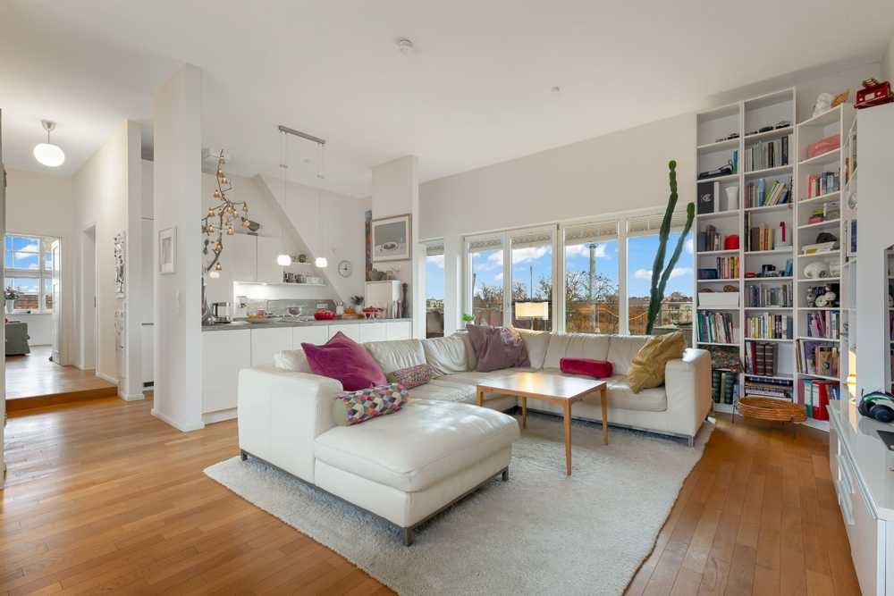 Im Jahr 2015 wurde das dritte Obergeschoss des Ensembles neu errichtet. In diesem modernen Gebäudeteil liegt die hier angebotene Drei-Zimmer-Wohnung, die den historischen Charakter des Hauses mit zeitgemäßem Wohnkomfort verbindet. Schon beim Betreten wirkt sie offen, hell und sehr harmonisch – ein wohliges Wohngefühl, das sofort überzeugt. Die großzügigen Deckenhöhen von etwa 3,20 Metern, das warme Eichenparkett und die weiten Ausblicke verleihen jedem Raum eine besondere Leichtigkeit.