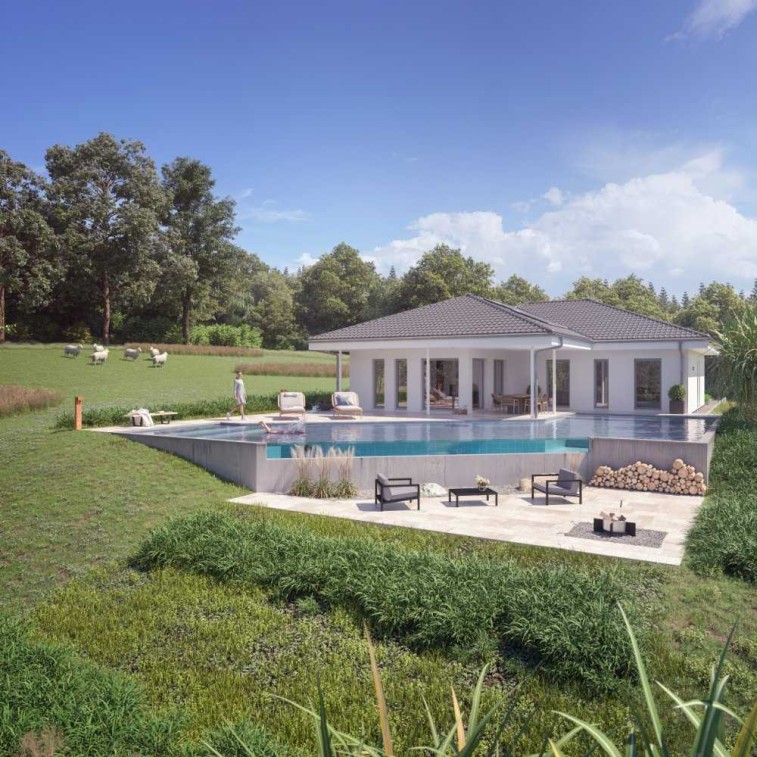 Der ausgesprochen geräumige Bungalow AMBIENCE 110 ist ein echtes Traumhaus. Auf der stattlichen Grundfläche von 10 m x 13 m sorgen ein Elternschlafzimmer mit Ankleide und zwei unterschiedlich bemessene Kinderzimmer für angenehmes Wohnen zu viert, bei dem jeder seine Privatsphäre leben kann.
