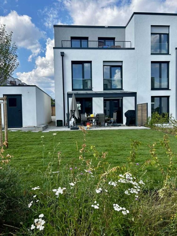 Im Erdgeschoss befindet sich der großzügige, offen gestaltete Wohn- und Essbereich mit direktem Zugang zu zwei Terrassen: einer ca. 22 m² großen Südterrasse sowie einer zweiten 9 m² großen Terrasse mit Pergola und flexiblem Sonnenschutz. Der gepflegte Garten ist vollständig eingefriedet und bietet Sonne bis in die Abendstunden. Eine hochwertige Einbauküche fügt sich perfekt ins moderne Raumkonzept ein.