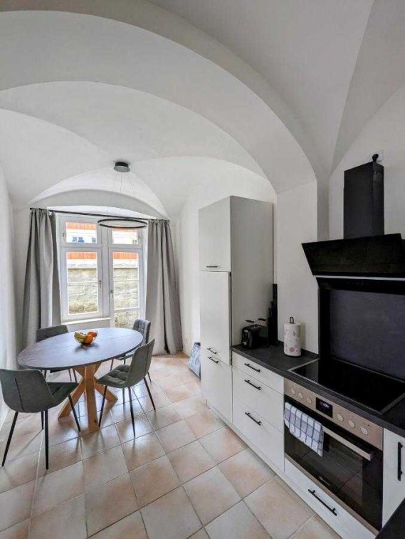 Die Wohnung befindet sich im Alten Gefängnis von Überlingen und verbindet dessen architektonischen Charme mit modernen Wohnansprüchen. Große Fenster und die hohen, abgerundeten Decken sorgen für eine besondere Wohnatmosphäre. Der offene Wohn-Essbereich mit Küche ist großzügig gestaltet.
