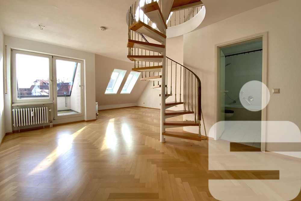 Diese Wohnung über zwei Ebenen, verbunden mit einer Wendeltreppe, befindet sich in einem Gebäude ohne Aufzug mit nur 8 Wohnungen. Sie erstreckt sich über das 3. und 4. Obergeschoss. Beide Ebenen der Maisonette-Wohnung verfügen über jeweils einen Zugang vom gemeinschaftlichen Treppenhaus.