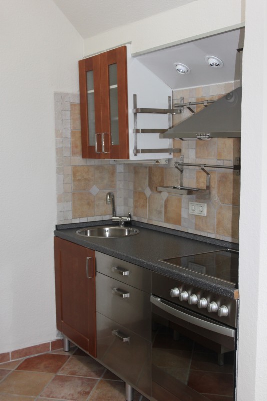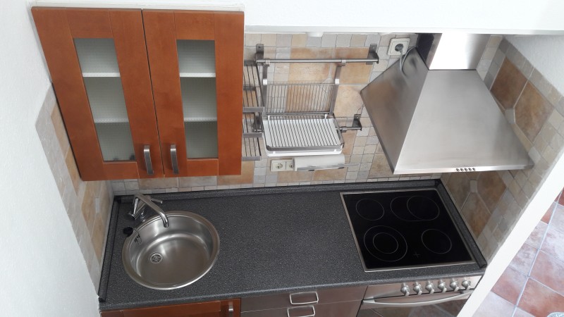 Der Wohnbereich mit Einbauküche (Ceran, Backofen, neue Kühl-/Gefrierkombination) ist hell gefliest. Im Schlafbereich wurde Laminat verlegt.