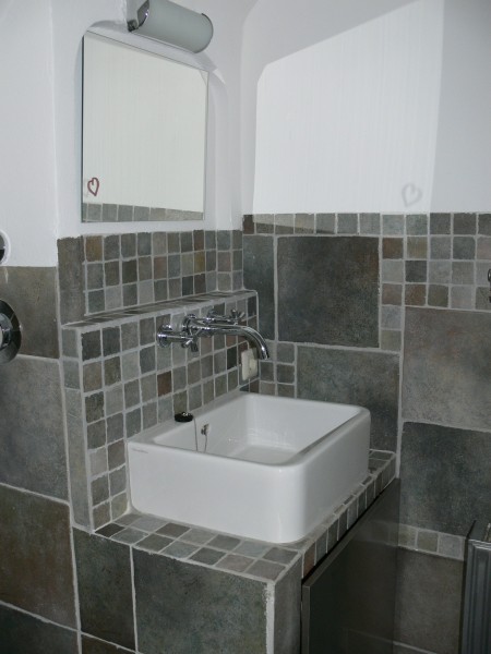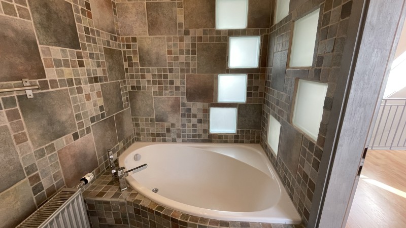Im Bad mit Badewanne fanden hochwertige Naturstein-Fliesen ihren Platz.