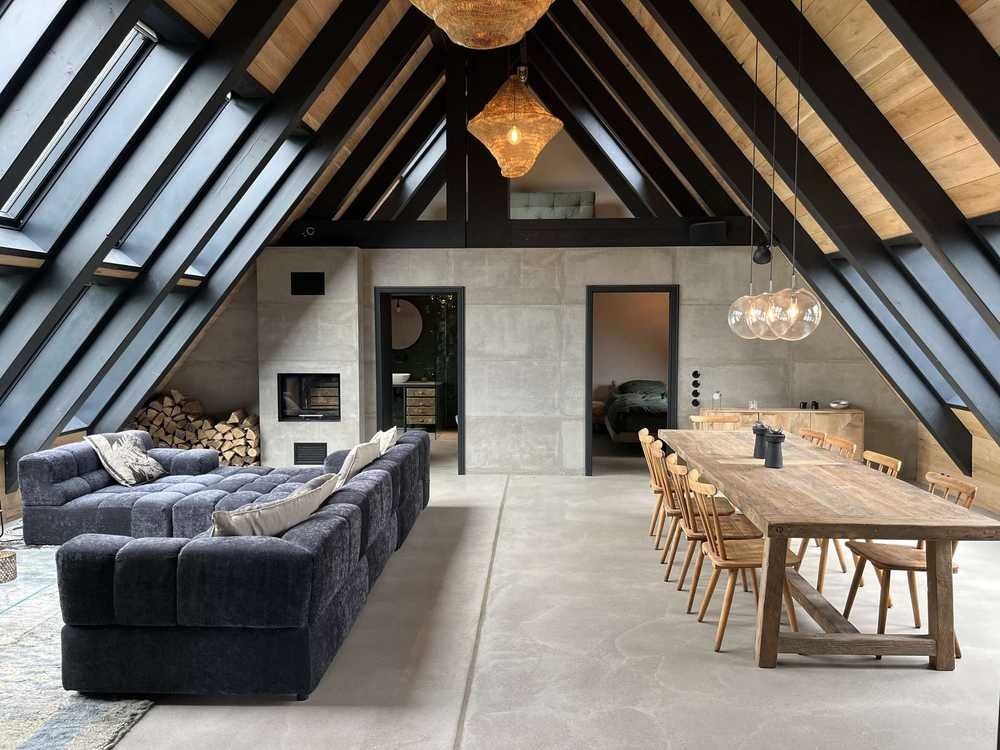 • Erdgeschoss: 6 Zimmer mit offener Struktur, Fußbodenheizung und Sichtbetonböden