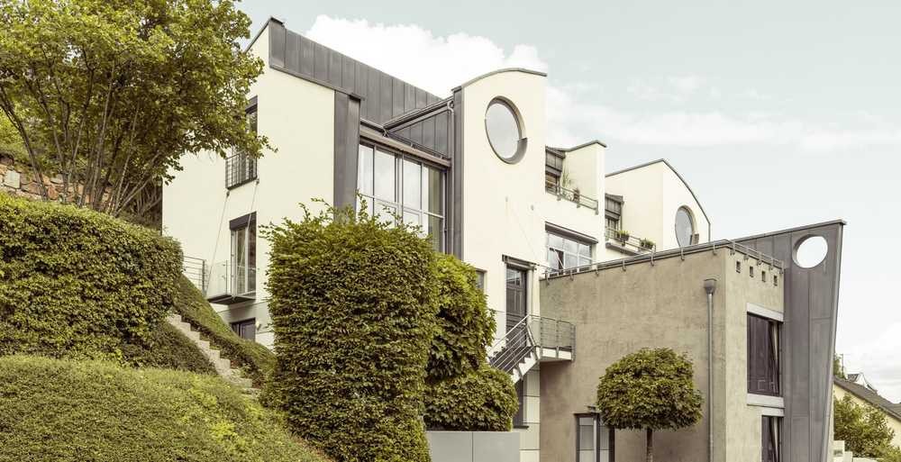 - Extravagante, abstrakte Fassade mit verspiegelten Fensterfronten