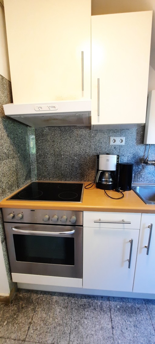 Voll ausgestattete Küche mit allen Geräten und Geschirr.