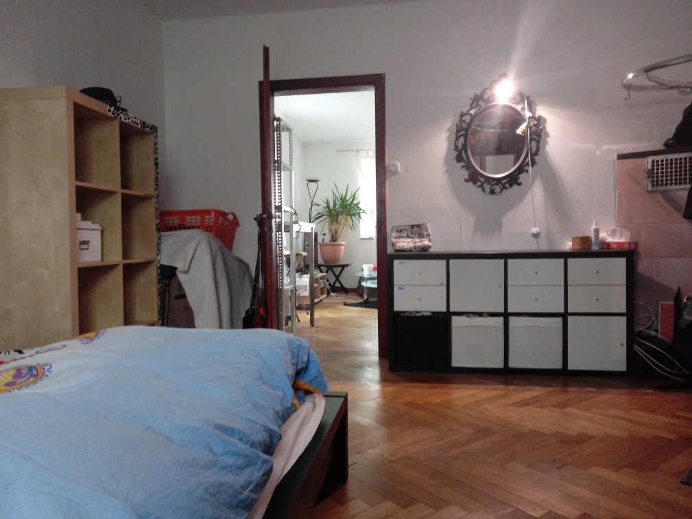 Schlafzimmer 1 ist mit einem Bett (160cm breit), Kommode, Regal und Schrank ausgestattet.