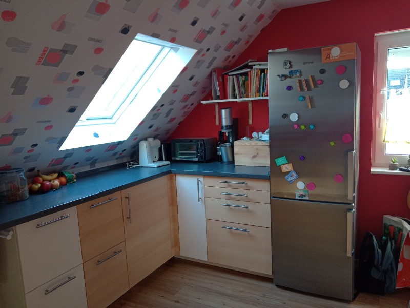 Die Wohnung hat ein großes Wohnzimmer mit offener Küche. Die Einbauküche sollte übernommen werden.