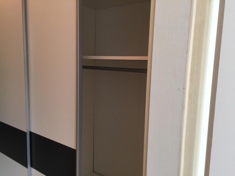 Pantryküche und eingebauten Kleiderschrank mit Schiebetüren.