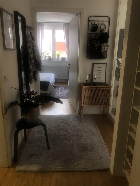 Die Wohnung liegt im fünften Stock des Gebäudes, ein Aufzug ist vorhanden. Es gibt außerdem einen Fahrradraum. Zum Haus gehört ebenfalls ein Hausmeisterservice, der sich gut um alles kümmert. Die Nachbarn sind sehr nett, viele junge Familien, Paare und Singles in den 30er/40er.