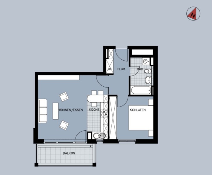 - 2 Zimmer, davon ein Schlafzimmer und eine große offene Wohnküche mit Wohnbereich