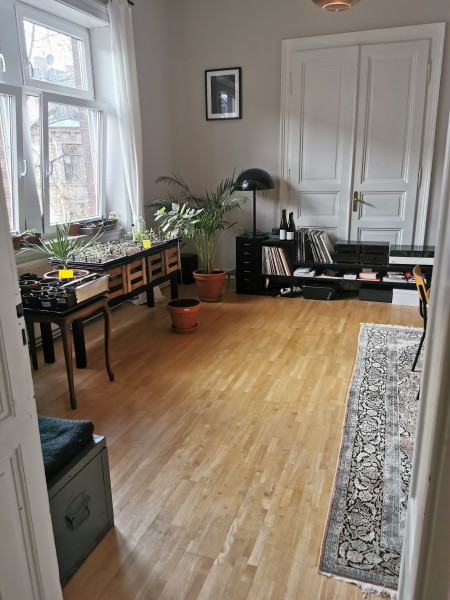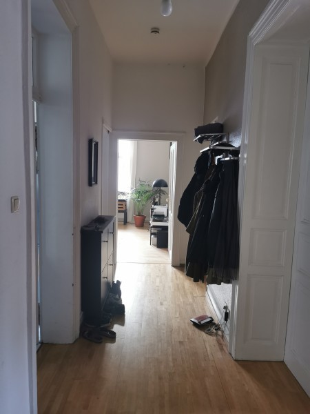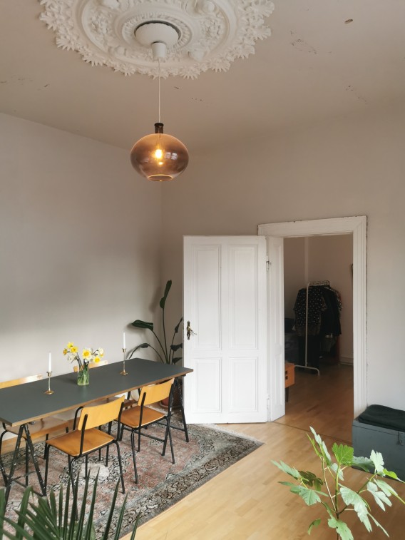 Die ganze Wohnung ist 110 qm groß und hat einen wunderschönen Altbau charm, mit dem stuck an den Decken.