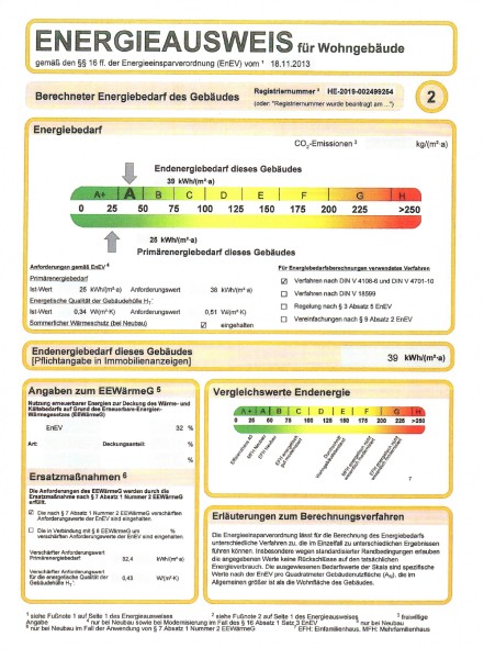 | Endenergiebedarf: | 39,00 kWh/(m²*a) |
