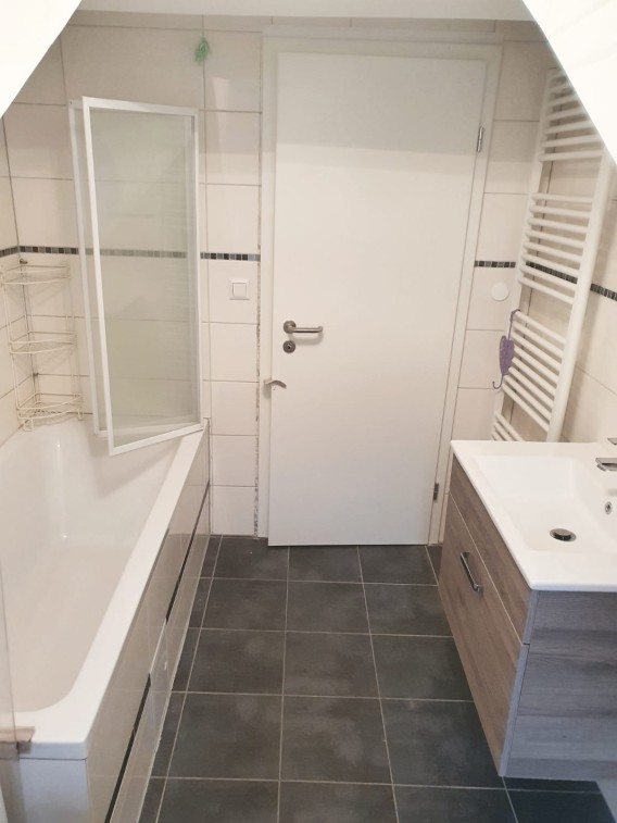 Das Bad verfügt über eine Badewanne mit Duschmöglichkeit. Eine Waschmaschine ist vorhanden, ebenso im Bereich des Waschbeckens ein Spiegel und ein Waschbeckenunterschrank.