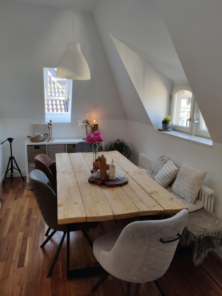Die Wohnung befindet sich im Dachgeschoss eines Denkmal geschützten Altbaus direkt am Marienplatz.