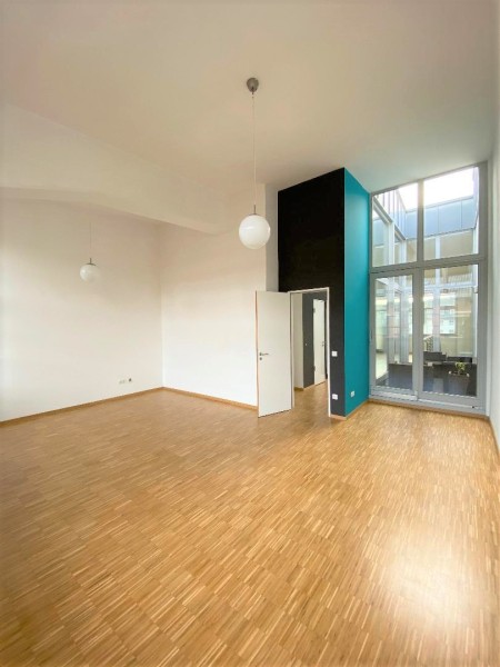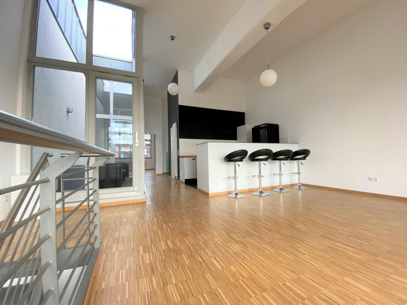 Durch die großflächigen Fenster und hohen Decken (3,40 m) sowie einem frisch aufbereitenden Parkettboden besticht das Maisonette-Loft durch ein ganz besonderes helles und hochwertiges Flair.
