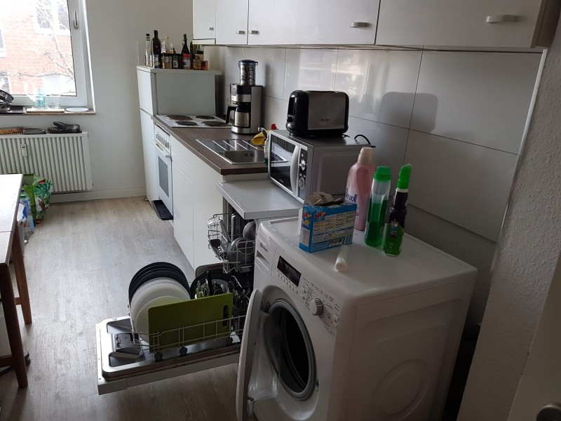 2 Schlafzimmer (eins hat zusätzlichen Nebenzimmer), WC und Dusche in einzelnen Räumen, Küche kann übernommen werden mit Kühlschrank, Herd+Backofen, Spülmaschine, Waschmaschine.