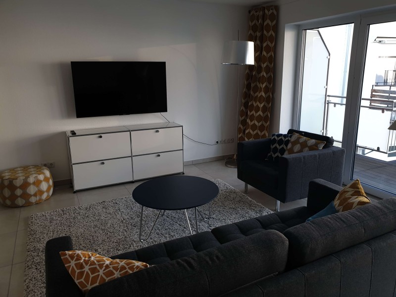 Das Apartment verfügt über ein Schlafzimmer, einen großen Flur, einen Abstell- und Wäscheraum, großzügiges Bad sowie einen großen, hellen und geschmackvoll eingerichteten Wohnraum mit integrierter moderner Küche und gemütlichem Essbereich. Die Einrichtung ist hochwertig und dezent. Der Wohnbereich ist mit einem bequemen Sofa und Sessel, USM-Haller Sideboard, 52“ Smart TV, Couchtisch, kuscheligem Teppich, Kommode und geschmackvoller Beleuchtung ausgestattet. Die offene Küchenzeile verfügt über Spülmaschine, Retro-Kühlschrank, Backofen, Induktions-Herd, Wasserkocher sowie sämtliche Kochutensilien und Geschirr. Der gemütliche Essbereich besteht aus einem geschmackvollen Tisch und vier Stühlen. Im großzügigen Flur befinden sich viele Aufbewahrungsmöglichkeiten: eine helle, große Regalwand, Kommode, Schuhschränke und Garderobe. Ein eleganter, großer Spiegel rundet die ansprechende Optik ab. Der Hauswirtschaftsraum verfügt über einen Samsung Waschtrockner, Bügeleisen mit Bügelbrett, einen Staubsauger sowie weitere Reinigungsutensilien.Im hellen Schlafzimmer erwartet Sie ein 140x200 großes, modernes Doppelbett mit zwei Nachttischchen und Leselampen, ein Lesesessel sowie ein geräumiger Kleiderschrank. Eine schicke Arbeitsecke mit Schreibtisch, Container und Schreibtischstuhl steht Ihnen hier ebenfalls zur Verfügung. Das Bad hat eine geräumige Duschkabine, ein großzügiges Waschbecken und Spiegel mit integrierter Beleuchtung.