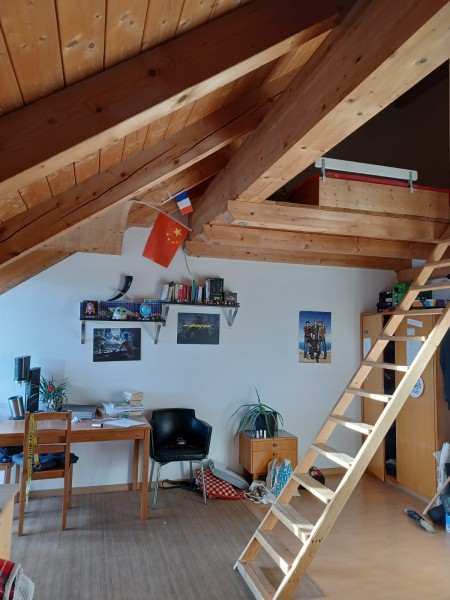 Zum 01.12.2022 wird eine 1 Zimmer Dachgeschoß Wohnung in Geretsried frei. Die hohen Wände wurden optimal genutzt um eine kleine 2. Etage einzufügen, auf der eine große Matratze Platz findet, sowie Platz für Bücher etc. Das Bett ist über eine Holzleiter erreichbar.