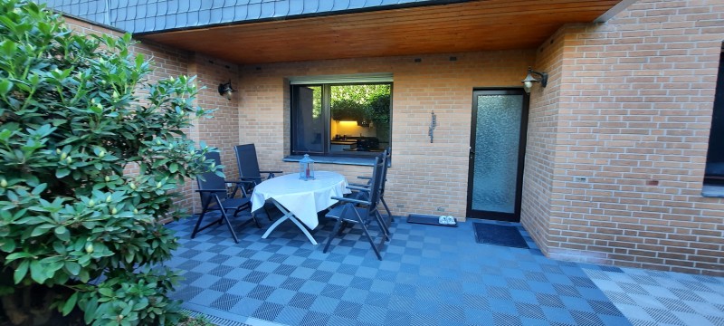 Die überdachte, möblierte Terrasse mit Blick in den Garten steht zur alleinigen Nutzung zur Verfügung. Rauchen ist auf der Terrasse möglich. In der Wohnung ist das Rauchen nicht erlaubt.