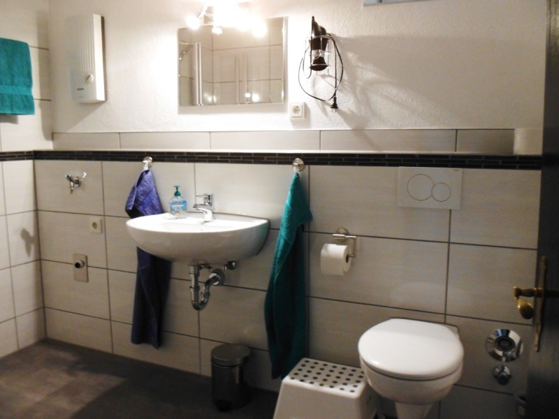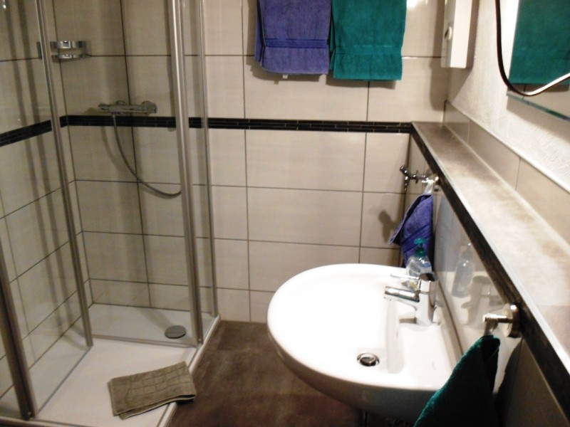 Das neu sanierte, in hellen Farben geflieste Bad - eingerichtet mit WC, Waschbecken und begehbarer Dusche.