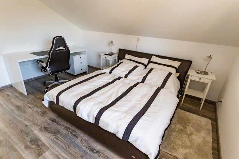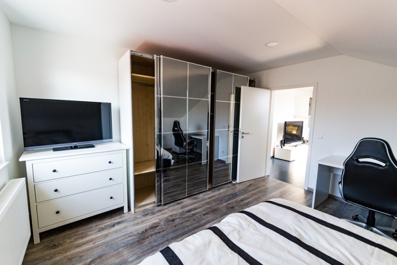 2 Schlafzimmer mit Doppelbett bzw. Einzelbett, Kleiderschrank, Schreibtisch und Fernseher.