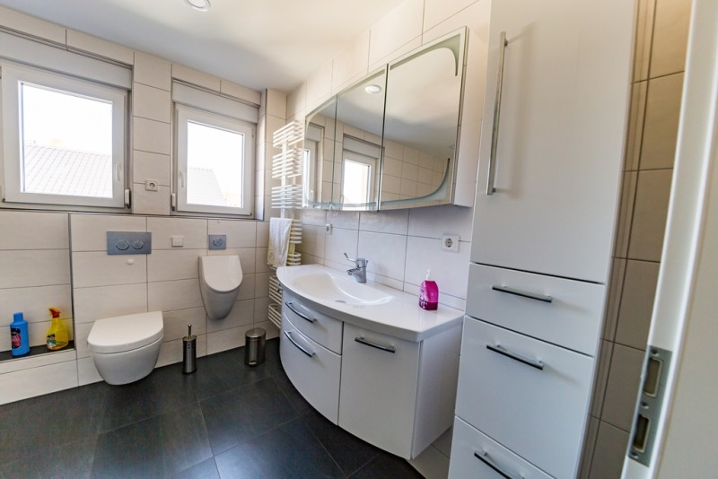 Bad mit Eckbadewanne, WC, Urinal, Waschbecken, Spiegelschrank, Waschmaschine, Trockner, Fön, Bügelbrett und Bügeleisen.