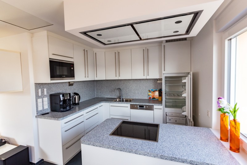 Offener Küchenbereich mit Kochinsel, Dunstabzug, Spülmaschine, Kühl-und Gefrierkombination, Elektroherd, Cerankochfeld, Mikrowelle, Kaffeevollautomat und Küchenutensilien.