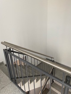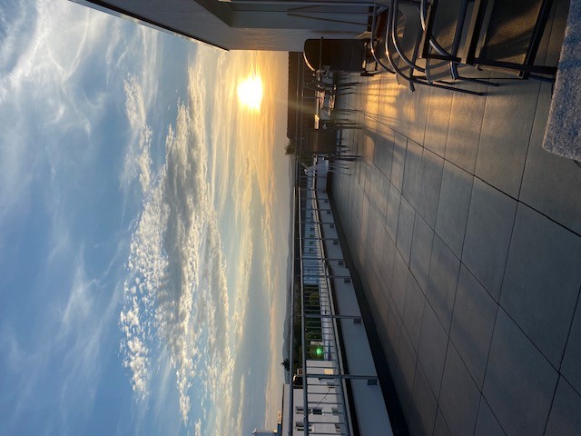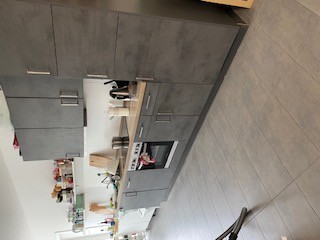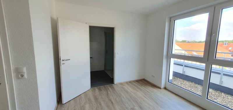 Das Zimmer ist hell, modern und hat ein eigenes Bad. Die Küche hat eine Spülmaschine. Von der aus kann man auf die Dachterasse gehen. Hier hat man einen schönen Ausblick auf Berge.