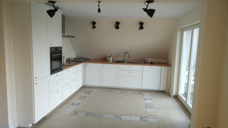 Hochwertige Küche (Spülmaschine, Waschmaschine, selbstabtauender Kühl-Gefrierschrank, Induktionsherd, selbstreinigender Backofen, Dunstabzug nach außen).