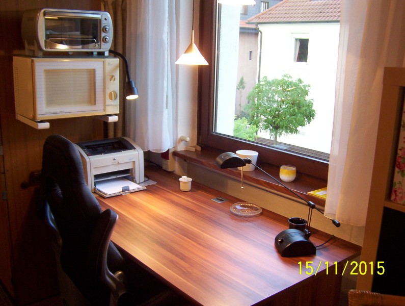 Vor dem Fenster steht ein neuer ,extrem großer Power-Schreibtisch mit den Maßen B/H/T 160 cm /75 cm / 80 cm in Walnußbaum-Nachbildung mit Kabelaussparung in der Mitte hinten!