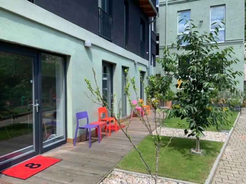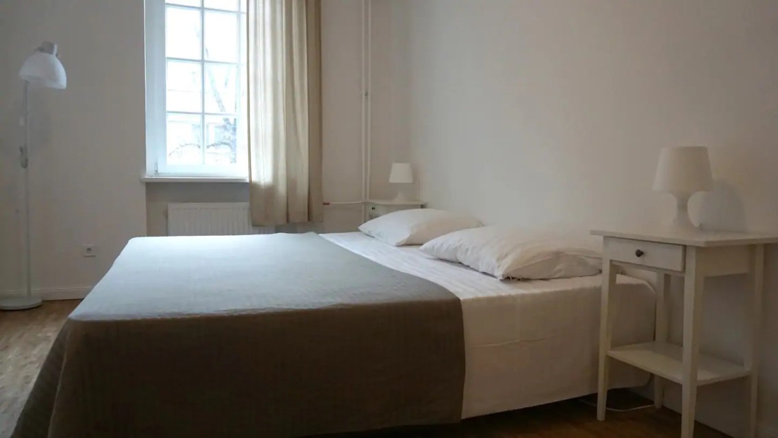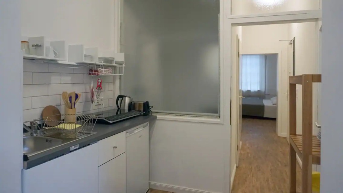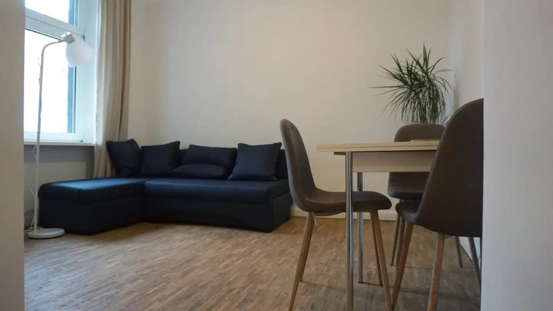 Die Wohnung hat ein Schlafzimmer, das zur Straße hin liegt. Die Fenster sind neu und dicht. Es gibt eine geschlossene Dusche. Es gibt auch eine ausgestattete Küche. Es gibt ein geräumiges Sofa.