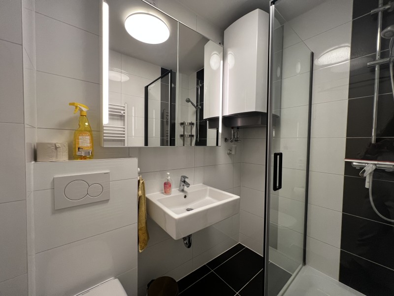 Die Wohnung zeichnet sich durch große Fenster, einen hochwertigen Vinyl-Boden und Zugang zu einer gemeinschaftlichen Küche aus.
