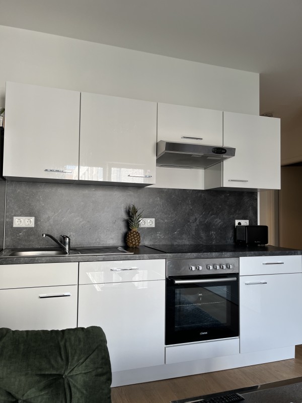 Zu dem Apartment zählt eine Einbauküche, mit Kühlschrank & Tiefkühler, Mikrowelle & allen Küchenutensilien, die man möchte.