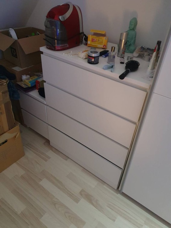 Die Fotos zeigen die Möbel, die im Zimmer sind.